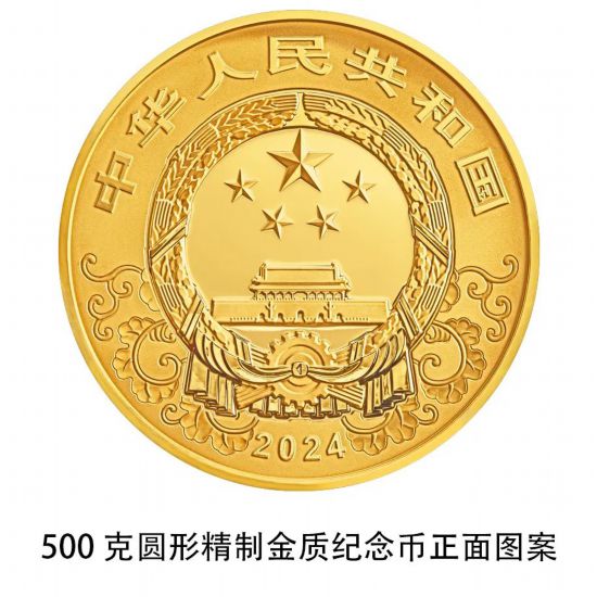 500克圆形金质纪念币为精制币,含纯金500克,直径80毫米,面额5000元,成色99.9%,最大发行量500枚。