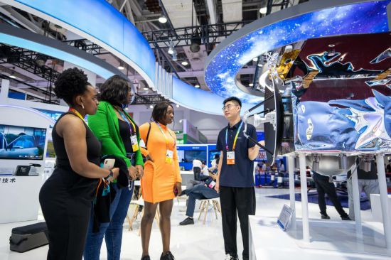 5月31日,参展商(右一)在第十三届中国中部投资贸易博览会上向观众介绍“天都一号”通导技术试验卫星。新华社记者陈思汗 摄