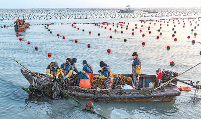 连日来,在山东省荣成市各大海洋牧场生态养殖区,渔民积极开展渔业养殖管护等海上作业。图为渔民在清理养殖筏架上的海草。