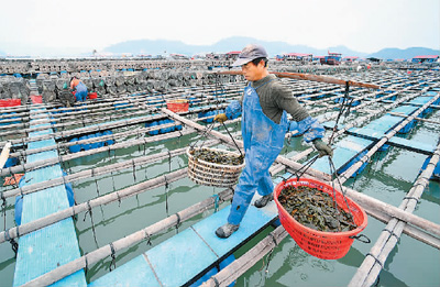 在福建省霞浦县,海参这几年逐渐成为当地海洋养殖的支柱产业之一。图为不久前,工人在挑运海参食用的海带。