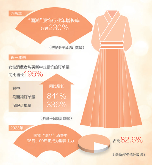 “马面裙成为‘爆款’,源自消费者对中式设计和面料的喜爱。透过服装这个窗口,我们可以看到95后、00后等群体对中华优秀传统文化的热爱。”织造司汉服品牌创始人林威表示。得物APP数据也显示,2023年国货“潮品”消费中,95后、00后正成为消费主力,占国货“潮品”消费的82.6%,其中00后消费占比近六成。